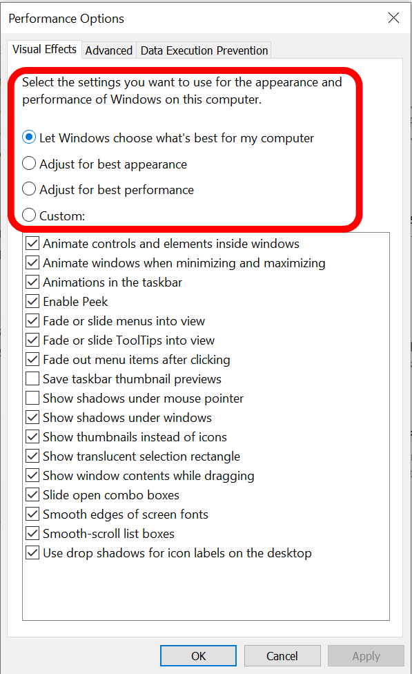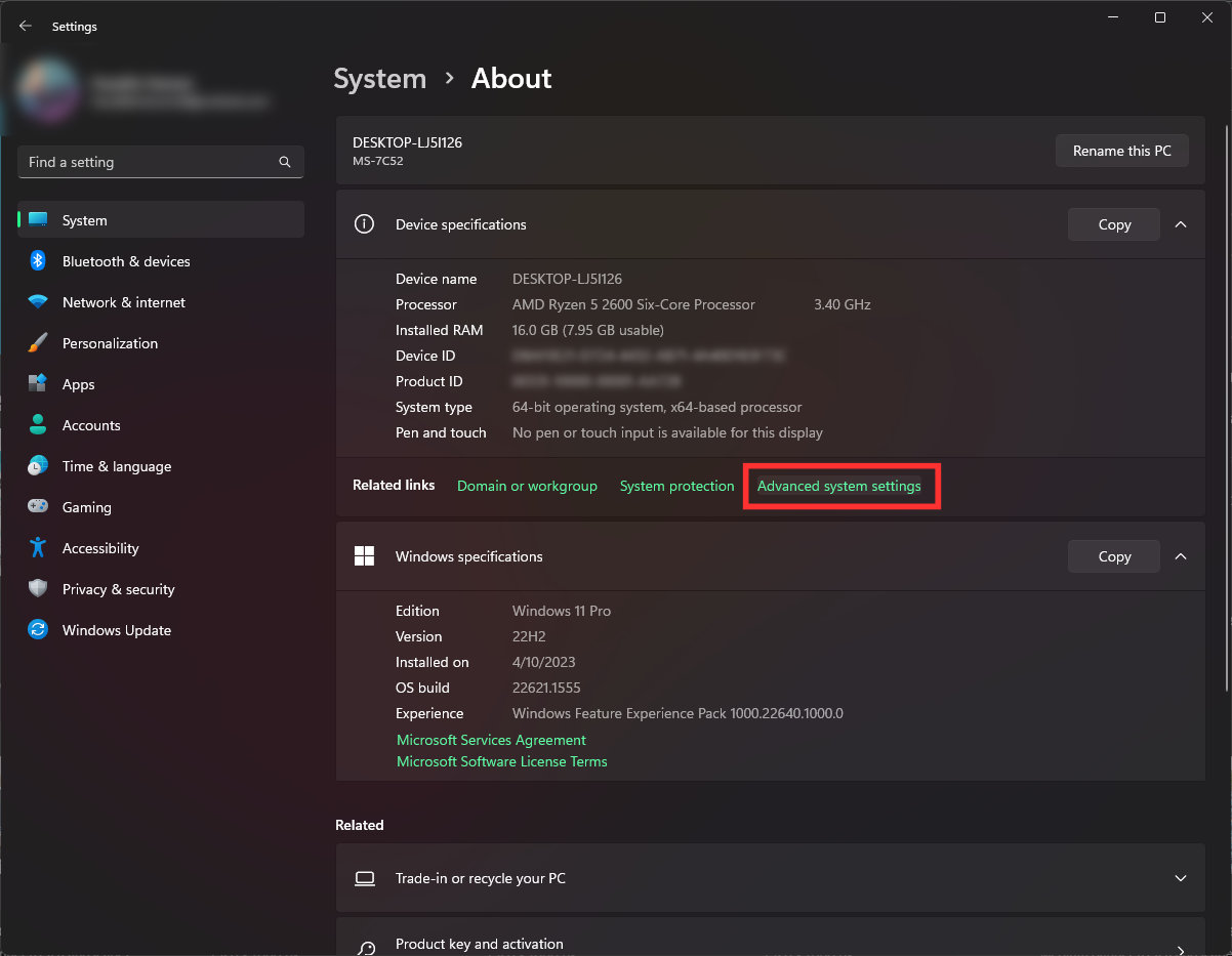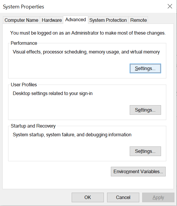 If you are getting warnings that your system has run out of virtual memory, increasing it should help. Go to Menu > Settings. To access further configuration options, type “Advanced System Settings” in the search bar. Accessing Windows Advanced System Settings In Windows 11, search “Device Specifications” and look for the setting in the Related links row. Simply click on it and you should get to the destination window directly. Advanced system settings option in Windows 11 For Windows 10, after accessing “Advanced System Settings“, you will see “Performance” section. Here, click the “Settings” option. Settings: Windows Performance Next, you will see “Performance Options“. The best choice here is to set it to “Let Windows choose what’s best for my computer”. This will allow Windows to optimize the memory and usage itself. However, you can also set it to “Adjust for best performance” if you feel that automatic adjustment by Windows isn’t effective. The “Custom” option is also a good idea; however, it is not advised for beginners, as it can cause glitches in your system.