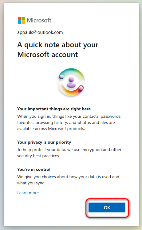 - A quick note about your Microsoft account will appear; click OK. Your account is now ready! You’ll be redirected to your new Outlook inbox.