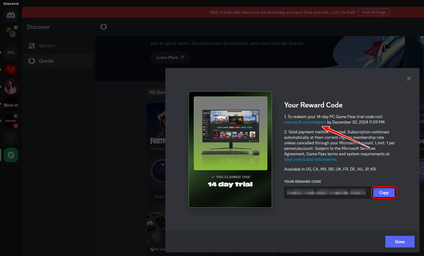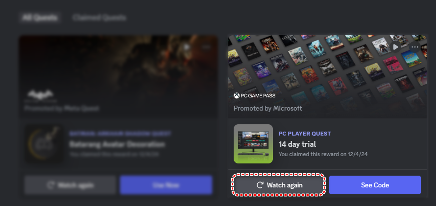 - Open Discord > Discovery > Quest, and click on the redeem link.