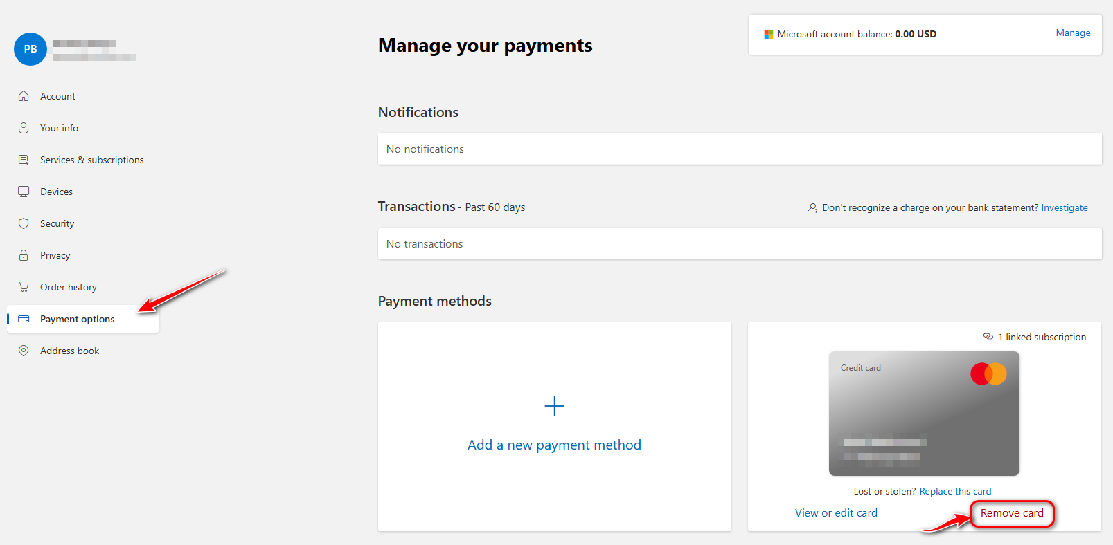 - Let’s remove the payment method by clicking on the Payment Option and removing your payment method.