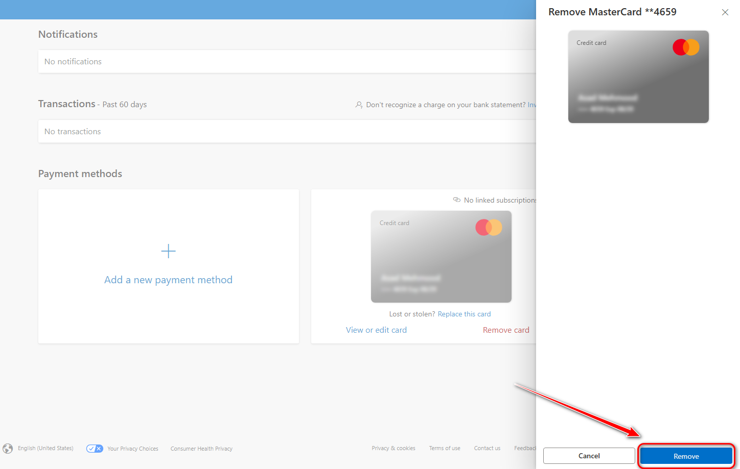 - Again, click on Remove to remove the payment method.
