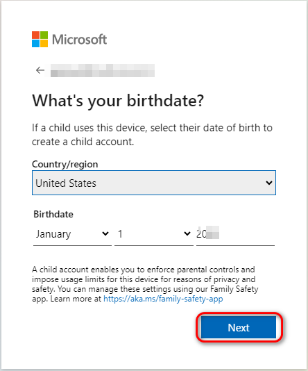 - Select your Country / Region and Birthdate from the dropdown menus and click Next to proceed.