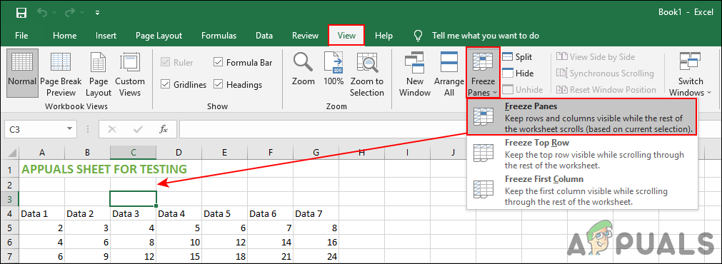 - Select the View tab from the top menu. Click on the Freeze Panes and select the Freeze Panes option in it.