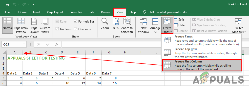 - Select the View tab in the top menu. Now click on the Freeze Panes option and choose the Freeze First Column.