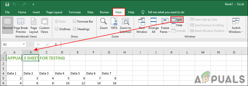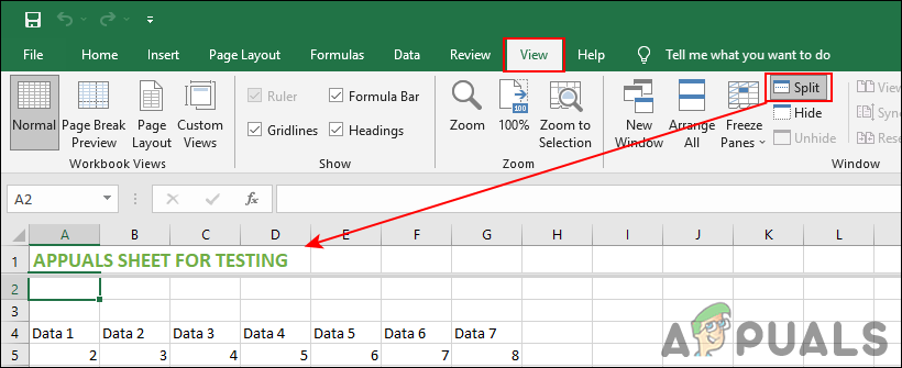 - Select the cell of the second row. Click on the View tab and then click on the Split option.