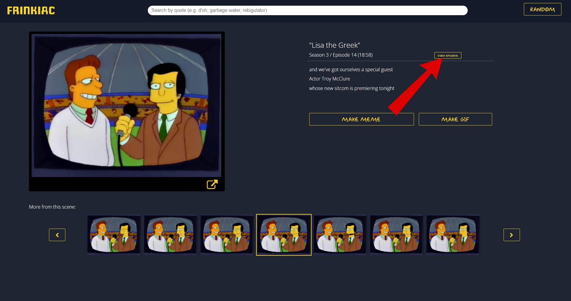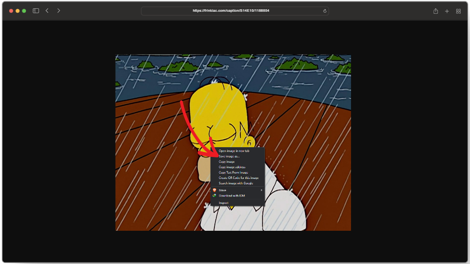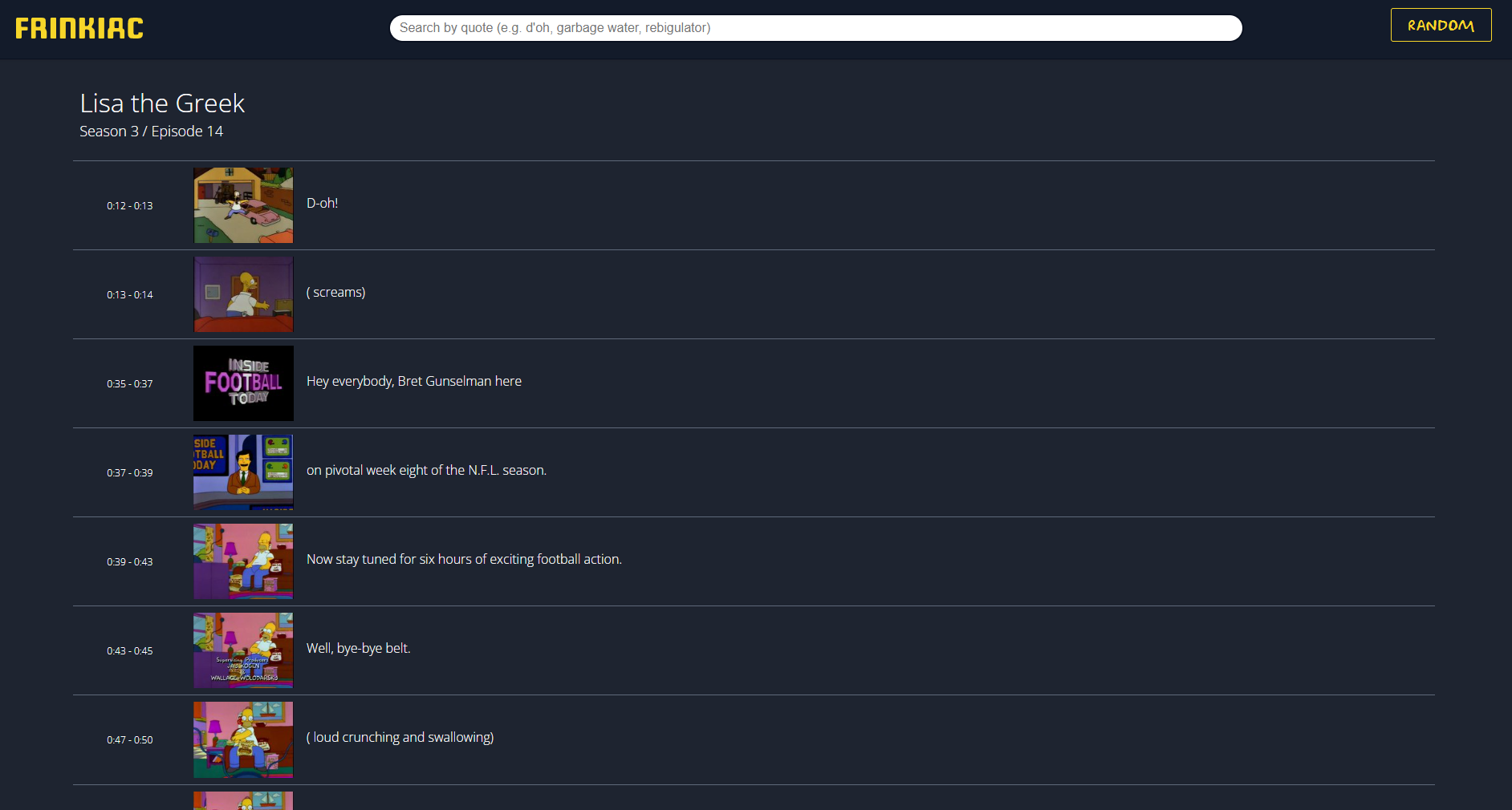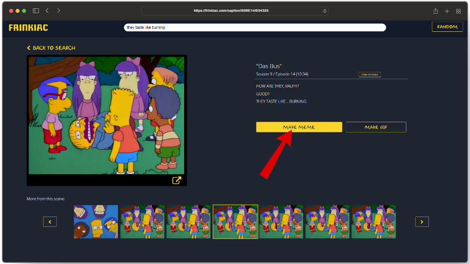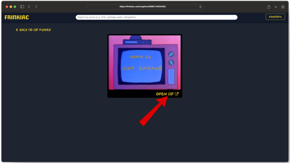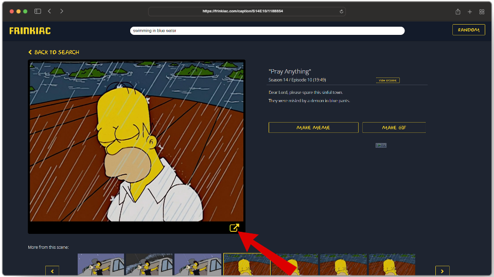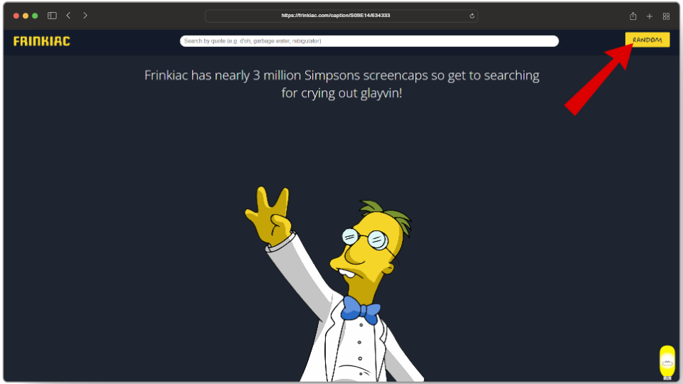 Another playful addition in Frinkiac is the “Random” option which allows users to test out their luck to see what frame they get from the show. To use this, click on the Random button located on the top-right corner, and you will have your image.
