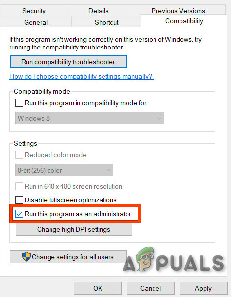 - Go to the “Compatibility” tab and check the box next to “Run as Administrator”.