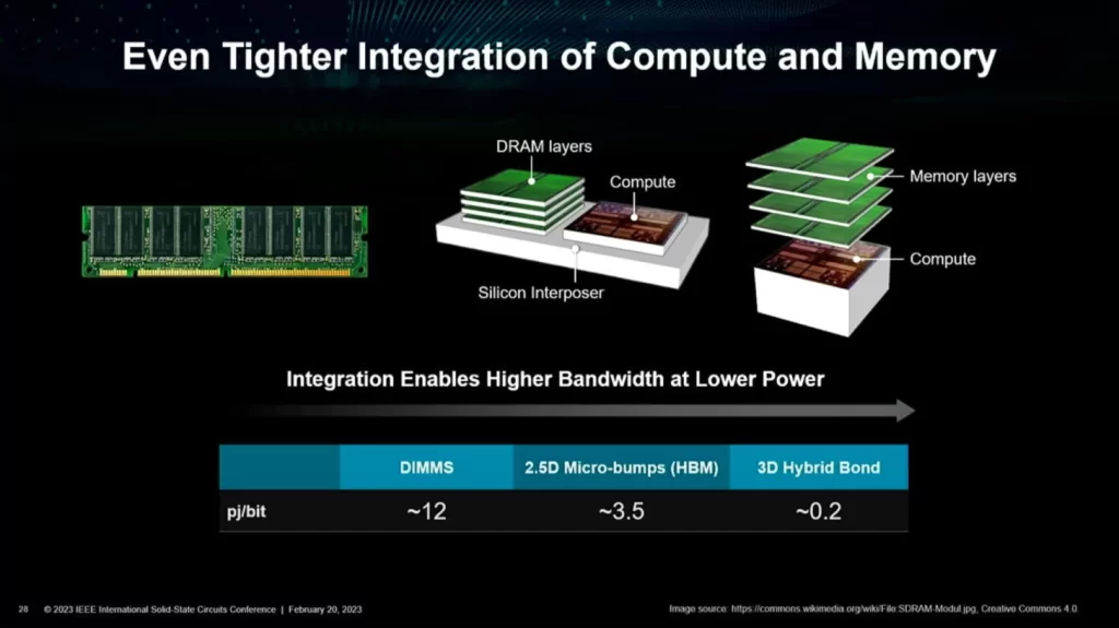 The first image is your typical DIMM configuration. The second is a 2.5D packaging technique and the last is a 3D stacked design. DIMMs use 60x more energy per bit than a 3D approach. That is simply insane, and should be more than enough to show why vertical stacking is the future and why 3D packaging matters.