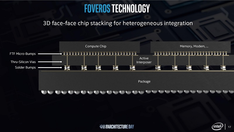 3D stacking is similar to 2.5D, yet it is so much different at the same time. Take it like this, in 2.5D stacking, we use a passive interposer right? Passive means it only routes electrical current. In 3D stacking, like Intel’s Foveros, the interposer is active (instead of passive), meaning that it also acts as an Integrated Circuit. Consider it like a die, similar to the compute tile (chip) placed on top of it.