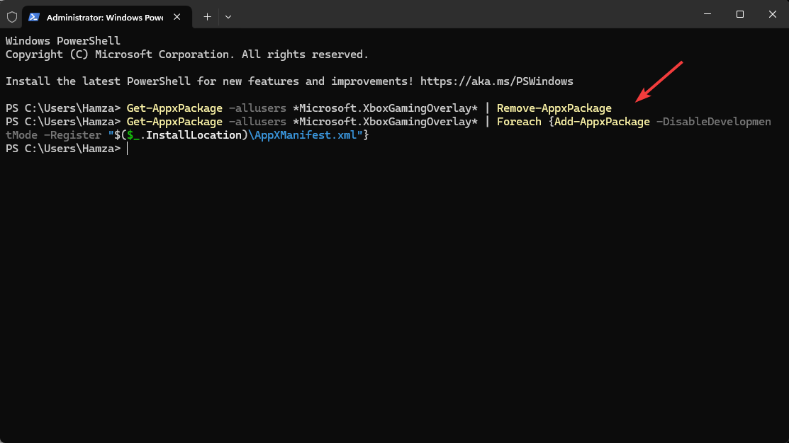 - In the terminal, enter the following commands to re-register the Xbox Game Bar: