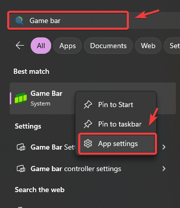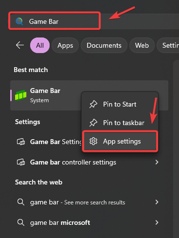 - Type Game Bar in Windows Search, right-click it, and select App Settings.