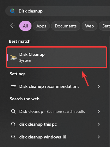 - To perform disk cleanup, click the Start Menu and type Disk Cleanup. Press Enter to run it.