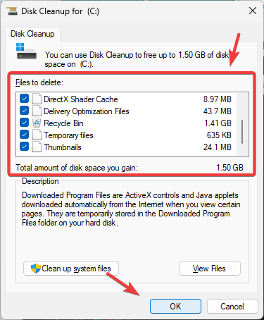 - Under Files to Delete, select all files and click OK to delete them.
