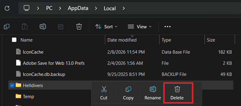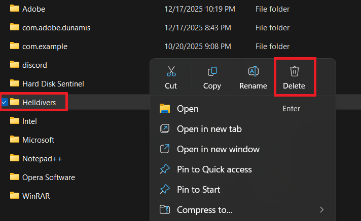 Removing Helldivers 2-related folders from the AppData directories can help because these locations store local configuration files, cached data, and other profile-specific files used during startup. If any of that local data becomes corrupted or outdated after an update or failed launch, it can interfere with GameGuard initialization and trigger Error Code 120.