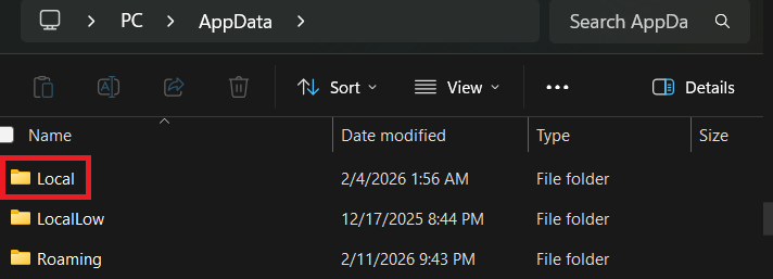 - Now go back one step, click AppData in the address bar, and open the Local folder.