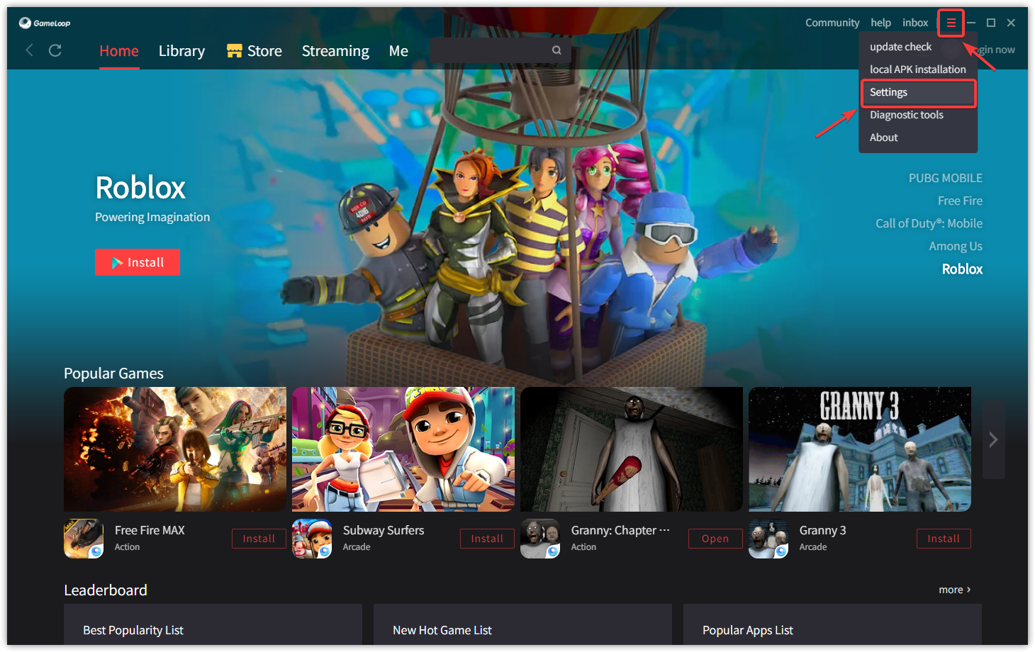 - Open Gameloop, click the menu icon in the top right corner, and select Settings.