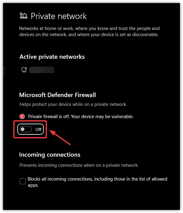 - Turn off Microsoft Defender Firewall by toggling the switch.