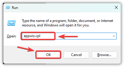 - Press Win + R, type appwiz.cpl, and press Enter.