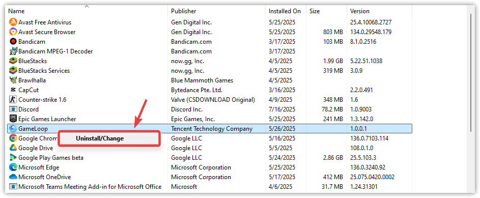 - Right-click Gameloop in the list and select Uninstall. Follow the on-screen instructions.