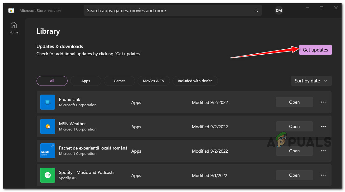 Install all pending UWP updates - Once every pending UWP update is installed, reboot your PC and see if the issue is resolved once the next startup is complete.