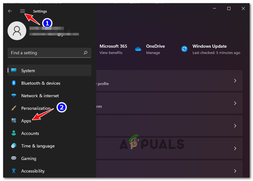- After entering the Settings menu, go to the Apps tab using the vertical menu on the left. When you enter the Settings window, if the vertical menu is hidden, click the action symbol at the top to reveal it.