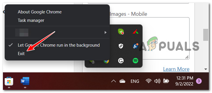 - Google Chrome conflict caused by background process – According to many users affected by this issue, you can also expect to deal with this problem when Chrome is not closed but is running in the background while this error occurs. To fix this particular issue, you can ensure that Chrome is not running in the background.