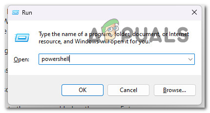 - Press the Windows key + R to open up a Run dialog box. Next, type ‘powershell’ inside the text box and press Ctrl + Shift + Enter to open Powershell with admin access.