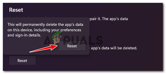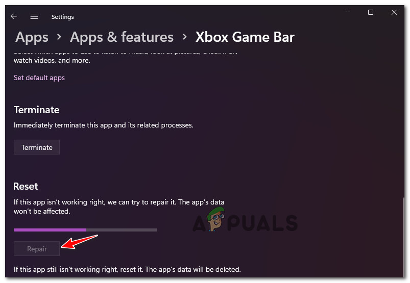 Repairing the Xbox component - If the Xbox Game bar still won’t open, attempt the second mitigation strategy by clicking Reset in the same Advanced Options window.