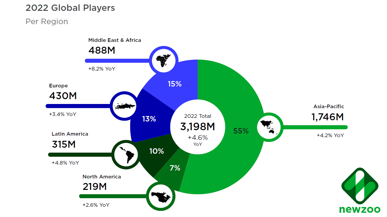 The Asia-Pacific region, which spends around 87 billion on gaming annually and accounts for 48% of the industry, will have the most players in 2022. With 48.4 billion in expenditure, North America comes in second place and accounts for 24% of total annual spending. This is declining globally on both the PC and console gaming fronts, particularly after 2020 saw yearly video game console expenditure skyrocket by over $50 billion.