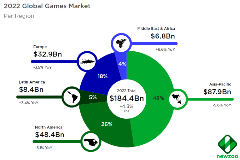 The 2022 Global Games Market Report from Newzoo estimates that about 3.2 billion individuals spent time playing video games in 2022, up from 2.9 billion in 2020, and the figure might reach 3.5 billion by 2025. Despite the boom, the games market fell 4.3% to $184.4 billion in 2022. Except after the epidemic, when so many people were in quarantine with nothing to do but play video games, that’s probably a straightforward fix.