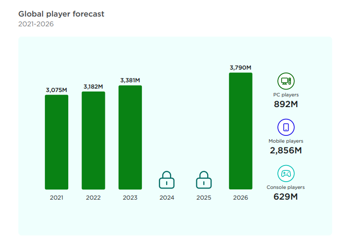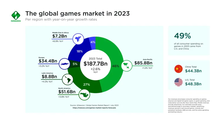 As for the regional distribution, the Asia-Pacific leads the global gaming scene, driven by India, China, Japan, and South Korea. In recent times, we can see how emerging markets in the Middle East & Africa and Latin America are experiencing a lot of rapid player growth due to better mobile internet, affordability, and a rising middle class. Not to mention, the rise of free-to-play games.