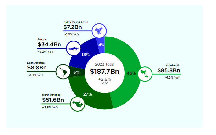 North America and Europe combined contribute about 46% alone to the global revenues, growing by 3.8% and 3.2% respectively. Middle East & Africa and Latin America quite surprisingly have shown strong growth at 6.9% and 4.3%. Asia-Pacific, that is now dominating with 46% share, has a mere 1.2% growth due to China’s slower 0.7% rate.