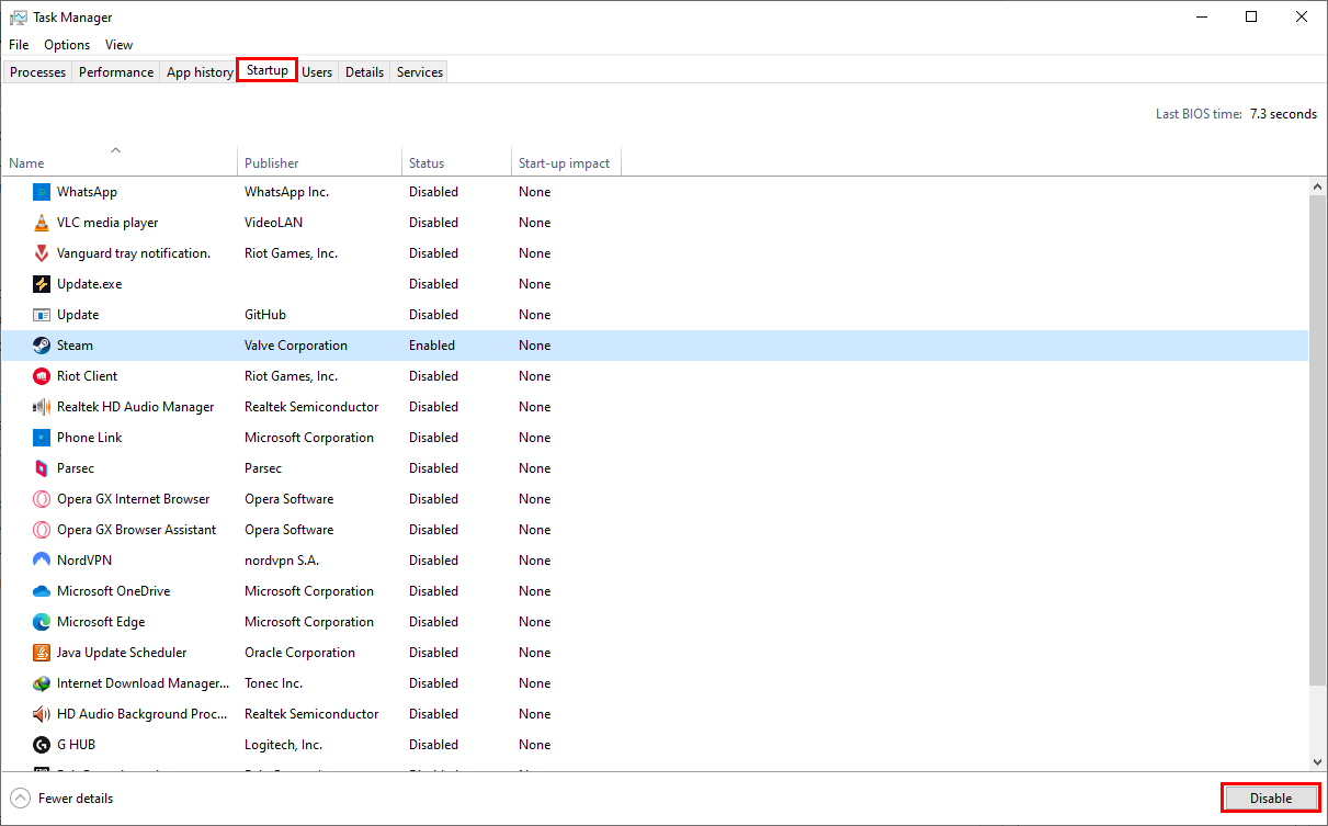 - In the Task Manager under the Startup tab, disable each startup item by selecting it and clicking the Disable button at the bottom right.