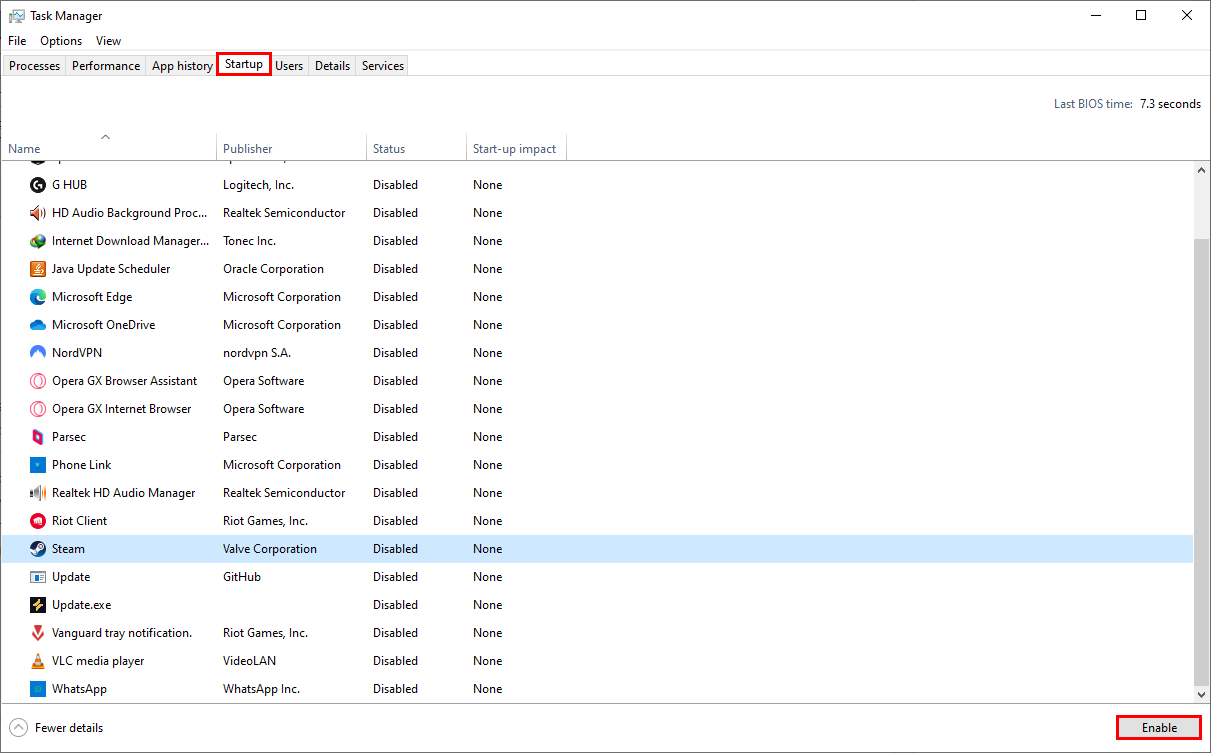 - In Task Manager, enable each startup item by selecting it and clicking the Enable button at the bottom right.