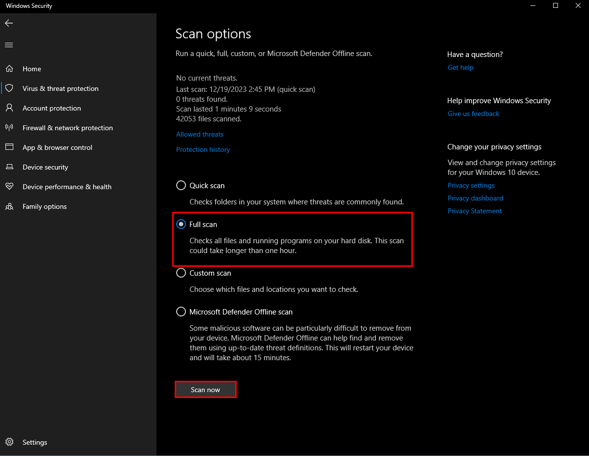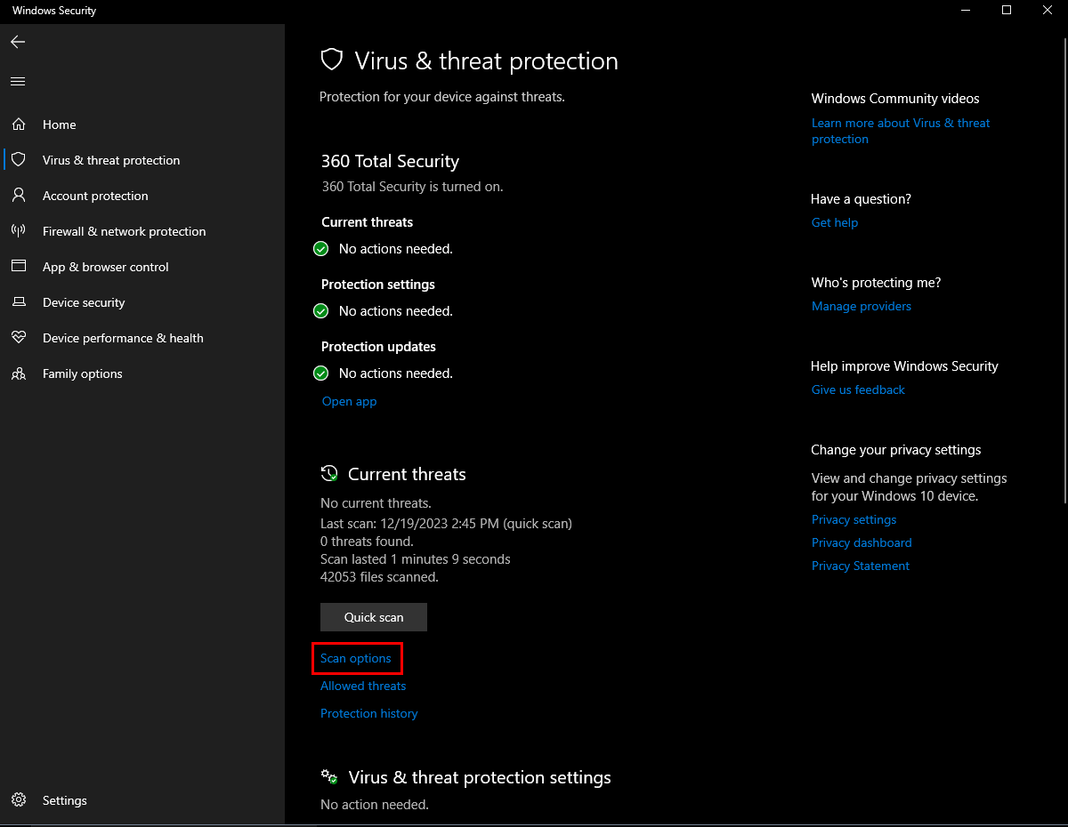 - Select Windows Security from the left pane, then Virus & Threat Protection.