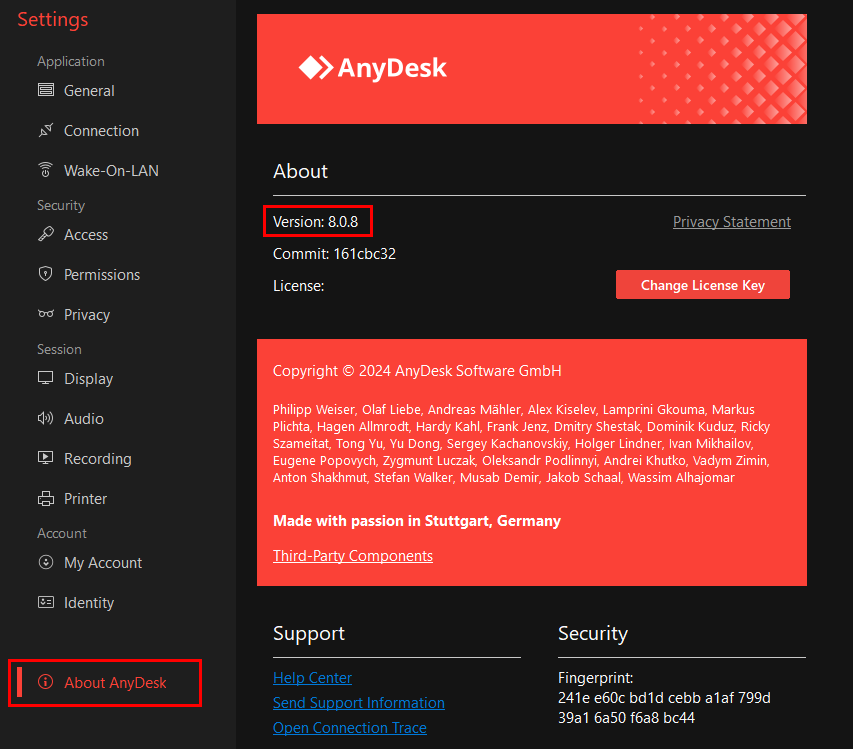 - Open AnyDesk to verify that the version is 6.0.10 or newer by checking the About section in the app’s settings.