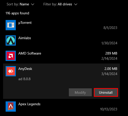 First, uninstall AnyDesk from your computer to remove any potentially corrupted files within the application.