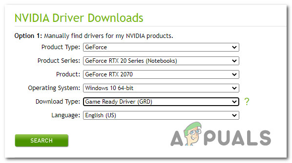 - Once you’re on the correct page, set the correct Product Type, Product Series, Product, Operating System, then choose Game Ready Driver (under Download Type). Finally, choose your language and click on Search to find the appropriate driver version.