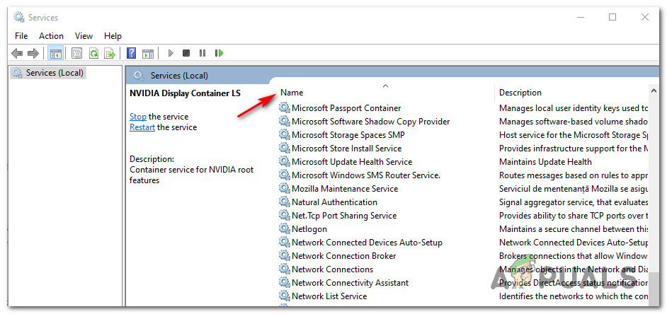 - Once you’re inside the Services screen, move over to the right-hand side section and click on the Name icon to order the list in alphabetical order.