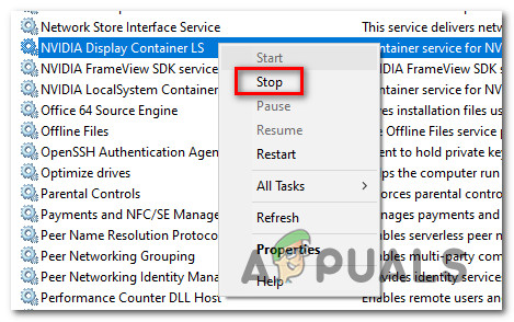 - Conflicting Nvidia service – If you’re seeing this error while attempting to uninstall an NVIDIA driver or an associated dependency, you can most likely fix the problem by disabling every Nvidia-related service via the Services screen before repeating the operation.