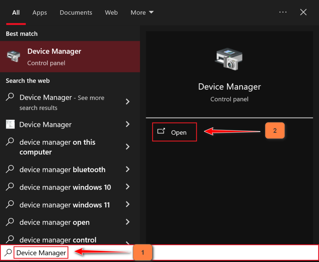 - Search for “Device Manager” in the Windows search box.