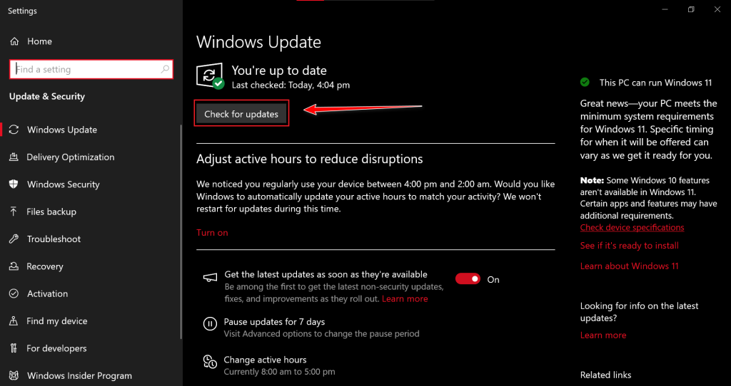 - Click on the Check for updates button.