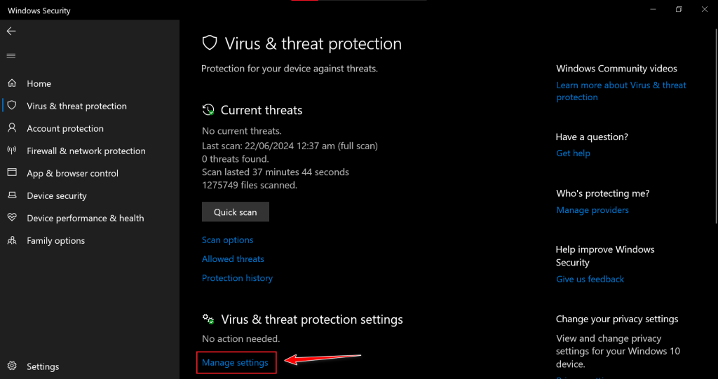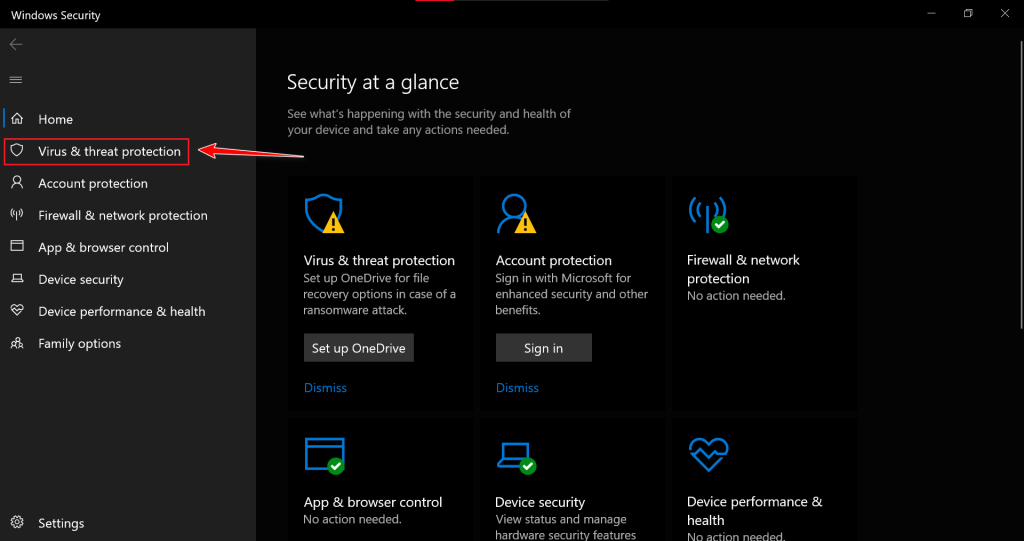 - Select the Virus & threat protection tab.