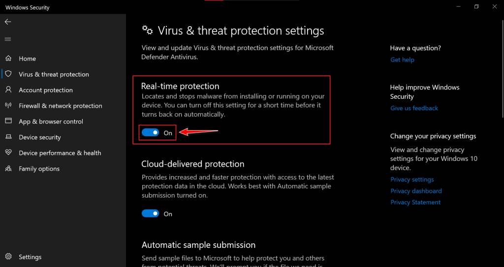 - Turn off the Real-time protection option.