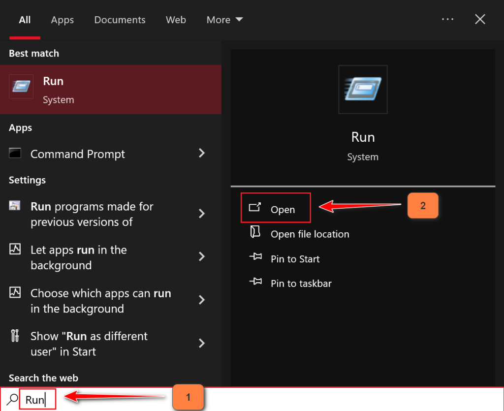 - Type “Run” in the Windows search box.