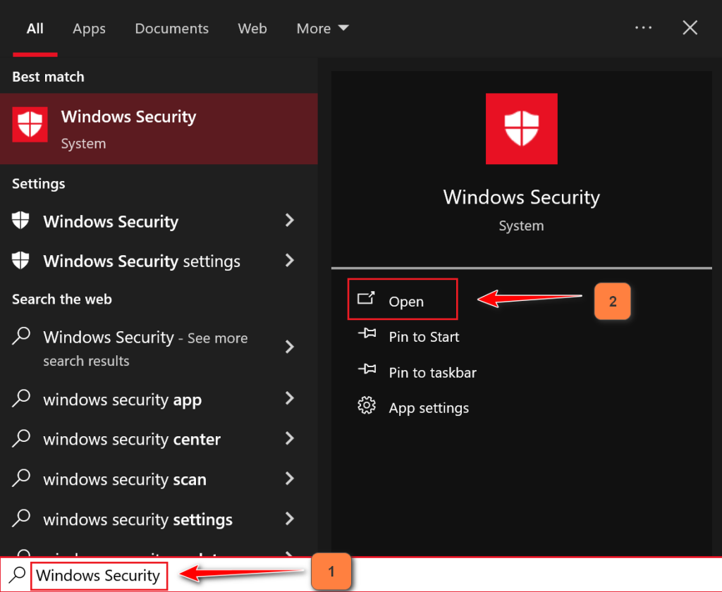 - Type “Windows Security” in the Windows search box.