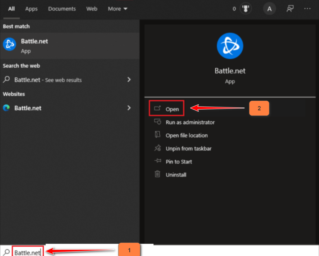 - Search for “Battle.net” in the Windows search box.