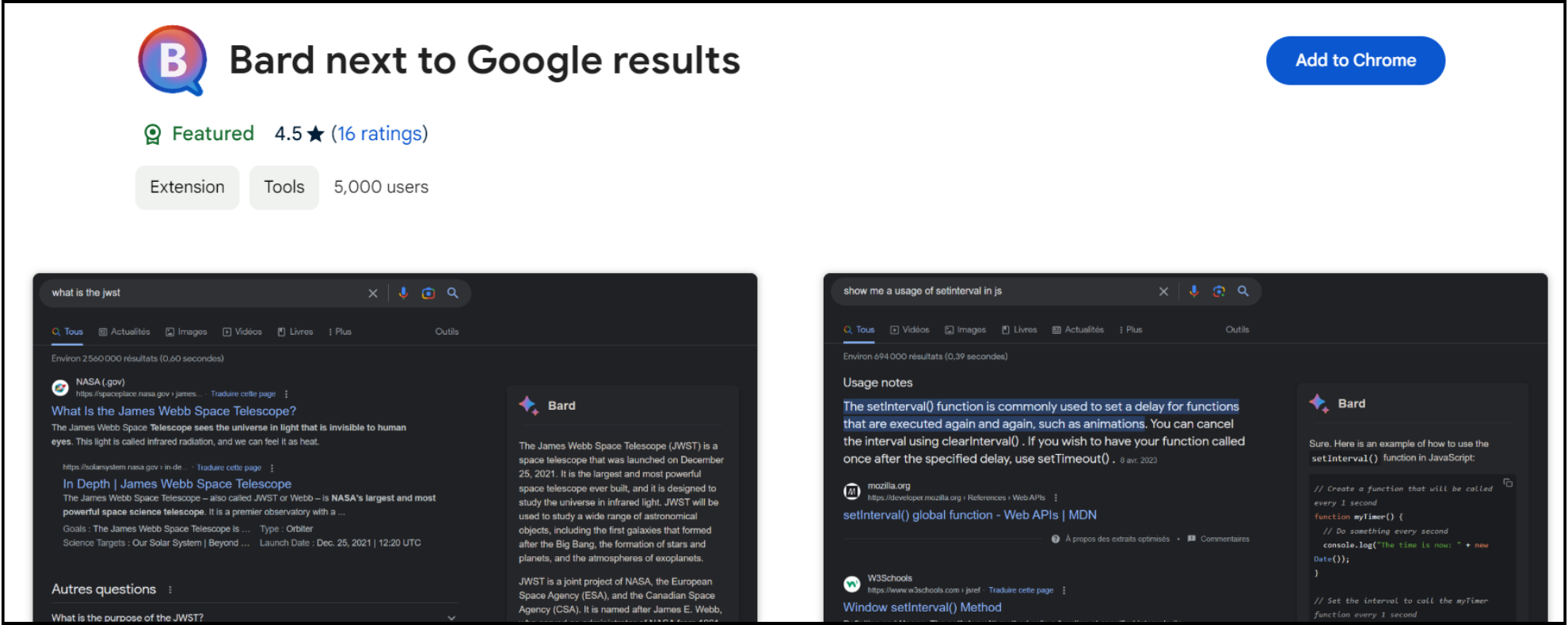 Go to the Chrome Web Store and look up Bard next to Google results - Select “Add to Chrome” and confirm the installation.
