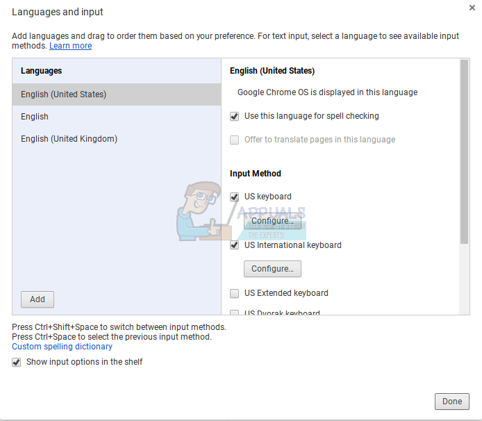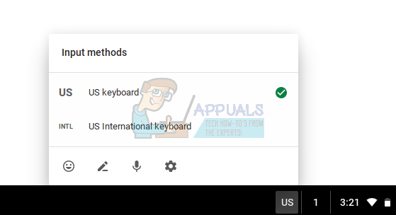 Once you check that box, you will see an Input Options button (‘US’ in the screenshot below) appear on the shelf, beside your notifications panel. When you click on this button, you will get access to Input method settings.
