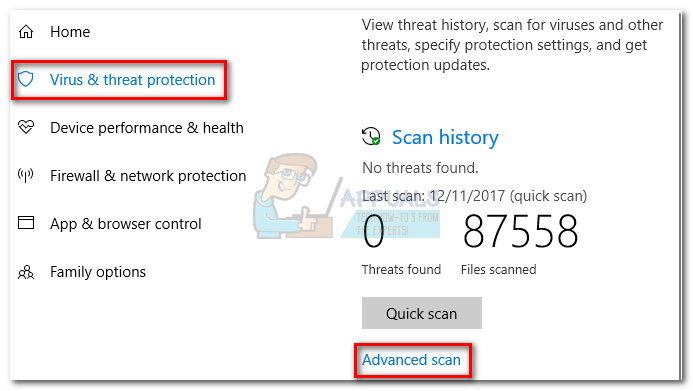 In Windows Defender, click on Virus & threat protection and click on Advanced Scan. Then, select the Full scan and hit the Scan now button.